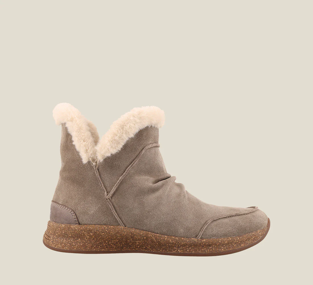 A new trainer-inspired construction fused with a casual pull on cozy bootie equals the best of both worlds! The upper is a high quality water resistant suede with slight pleating at the vamp, lined with luxurious faux fur, encompassing you in rich comfort, you won't want to take these off! The supportive polyurethane footbed has exceptional arch & metatarsal support, covered in premium microfiber for all day comfort. A rubber outsole with a unique honeycomb design is not only flexible, but durable for all day wear.