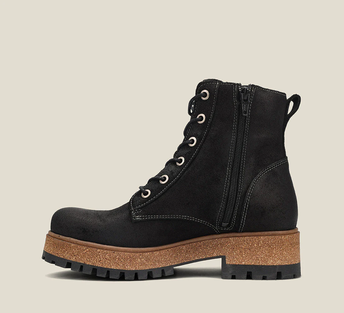 Main Street is our new European lace up platform boot. With artisan leather uppers that have been hand burnished giving this boot so much character, with a cork / polyurethane platform midsole that is extremely lightweight, and rubber lug outsoles that are durable and ready for anything! With a secret surprise inside, featuring soft faux fur & leather lining + a leather covered polyurethane insole that is removable with exceptional arch & metatarsal support - this boot has it all!