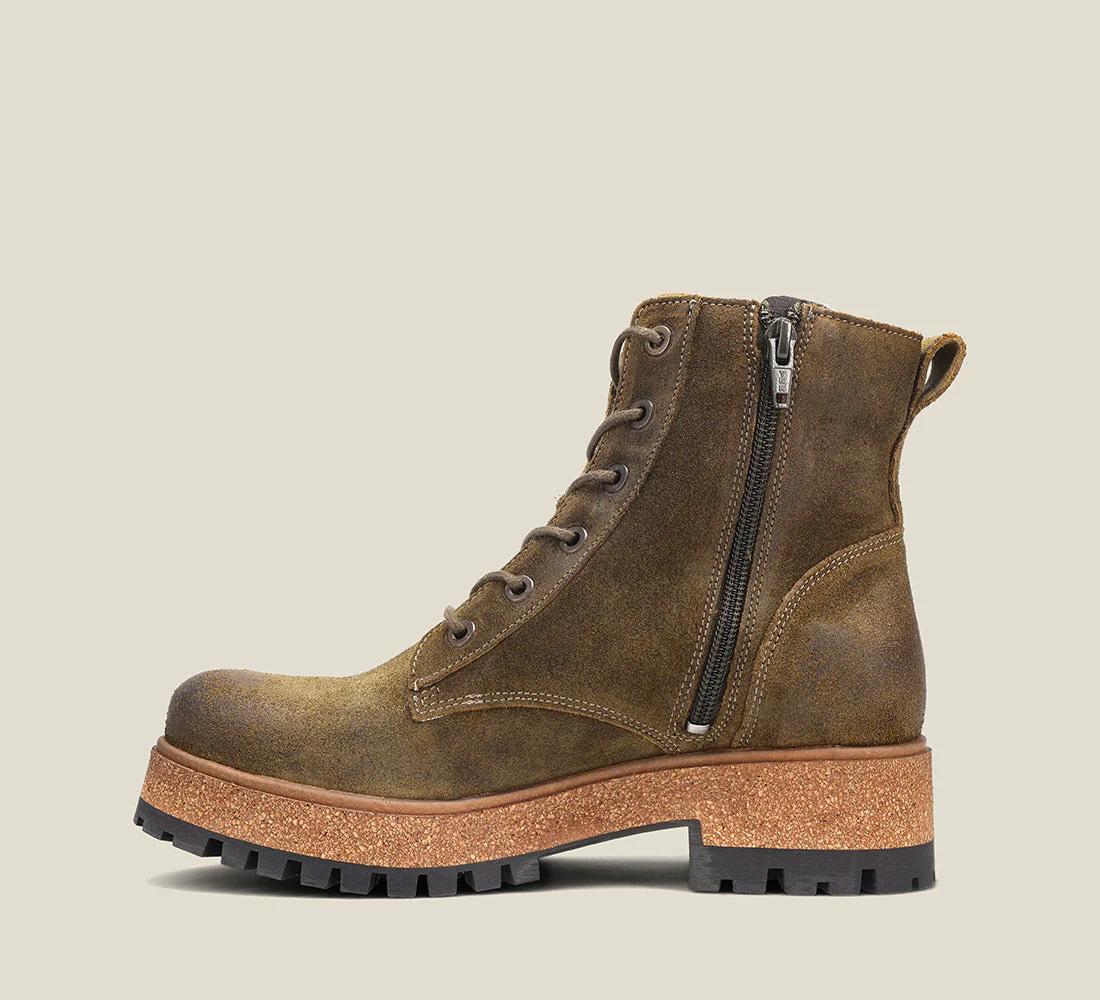 Main Street is our new European lace up platform boot. With artisan leather uppers that have been hand burnished giving this boot so much character, with a cork / polyurethane platform midsole that is extremely lightweight, and rubber lug outsoles that are durable and ready for anything! With a secret surprise inside, featuring soft faux fur & leather lining + a leather covered polyurethane insole that is removable with exceptional arch & metatarsal support - this boot has it all!