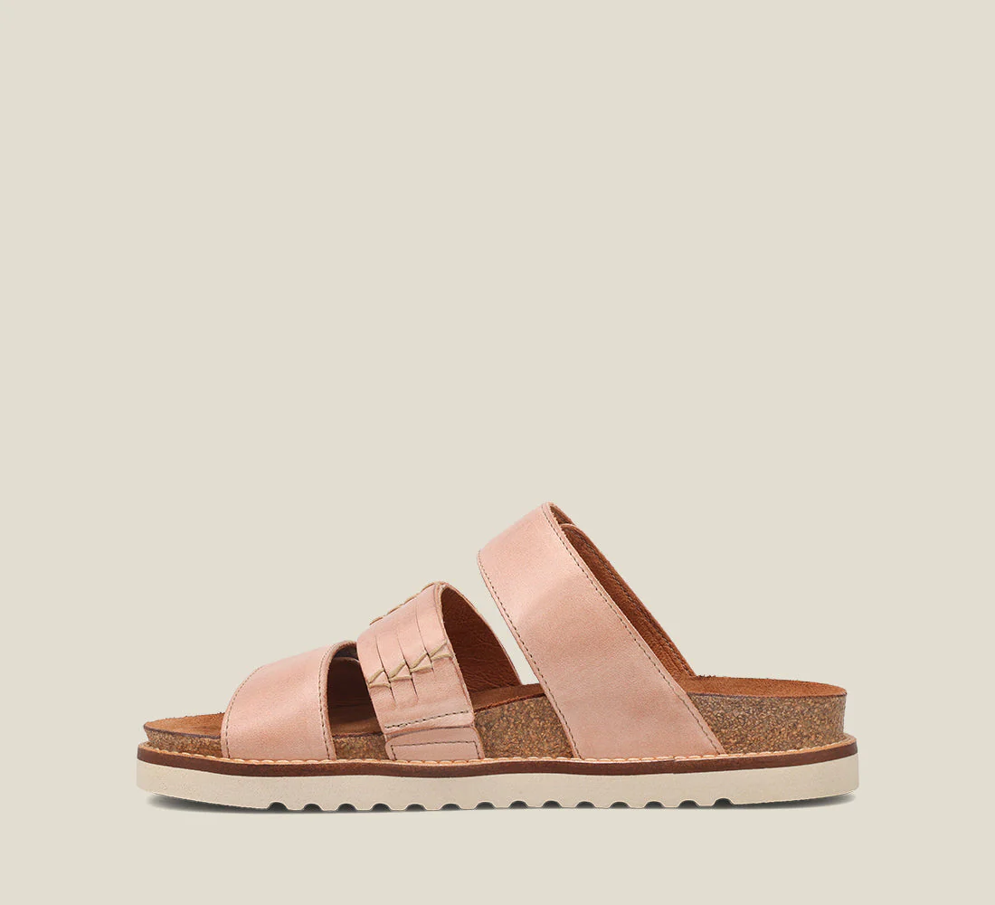 The Tremendous is a leather 3 band slide sandal made in Portugal. Quarter and forefoot straps are adjustable hook and loop while the middle strap offers inside gore. Design accents include stitched leather welts, decorative cross-stitching and scoring. Lightweight cork-latex midsoles are topped with soft padding with exceptional arch and metatarsal support and lined in luxurious suede. Off-white outsoles are lightweight, durable EVA.